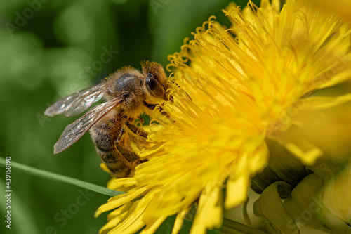 bee, flower, insect, macro, nature, yellow, honey, pollen, to fly, summer, green, spring, animal, garden, closeup, wild, nectar, plant, blowball, pollination, wing, flora, bumblebee, bee