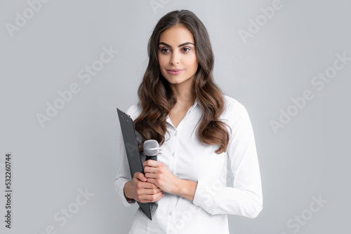 woman, microphone, clipboard, speaking, business, speech, girl, beautiful, portrait, young, grey, journalist, mic, conference, public, happy, isolated, talking, female, attractive, smiling, concept, speaker, pretty, presentation, face, grey, beauty, information, background, discussing, charming, model, gorgeous, caucasian, emotional