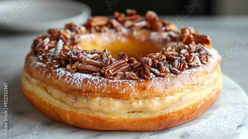 Puddingfilled Danish pastry ring, topped with praline pieces and dusted with powdered sugar, on a marble surface, Danish ring pudding pralines, elegant dessert ring
