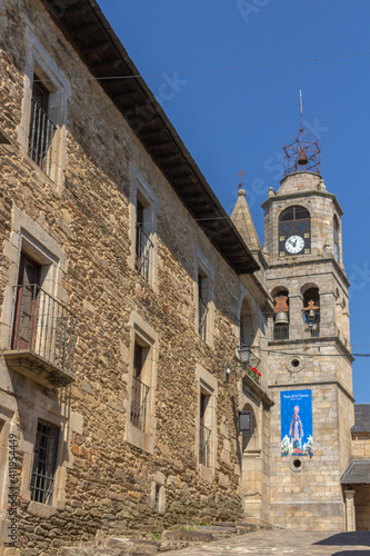 Puebla de Sanabria, Spain - September 6, 2020: Bell tower of Santa María del Azogue church (Iglesia de Nuestra Senora del Azogue) is a pretty village church that was first built in the 12th century.