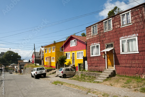 chile, colourful, blue, patagonia, red, sky, wood, house, america, white, holiday, tree, colours, hill, roof, resting, picturesque, view, green, yellow, old, style