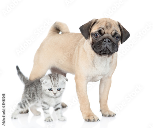 Pug puppy and scottish kitten stand together and look at camera. isolated on white background