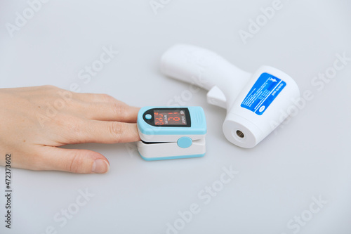 Pulse oximeter and thermometer gun on white background. Infrared isometric thermometer gun to check body temperature for virus symptoms. Measuring oxygen saturation, pulse rate and oxygen levels.
