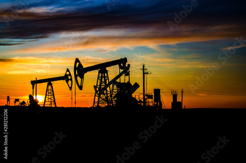 Pumping unit is working in oil field of the sunset. The contours of the oil rocking on the background of a beautiful sunset.