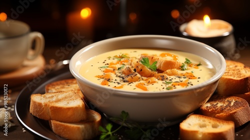 Pumpkin and carrot Cream soup on rustic wooden table. Autumn Pumpkin cream-soup with rosemary herb and croutons. Top view. Copy space.