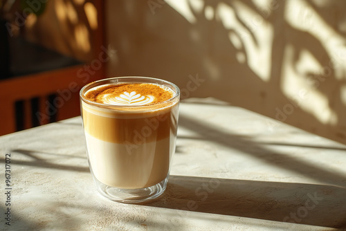 Pumpkin Pie Latte drink in modern off-white minimalist trendy stylish vegan plant-based cafe bar setting with stucco concrete wall, product photography, outdoors, sunny, beverage, bright, shadow play