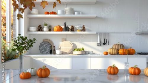 kitchen, pumpkin, pumpkin, interior, decorated, decor, harvest, autumn, fall, autumn, season, seasonal, background, halloween, jack, symbol, october, jack-o-lantern, natural, nature, light, window, cosy, copy space, space, announcement, advertisement, white, orange, shelf, contemporary, design, minimalist, clear, sunlight, sunny, open, charme, countertop, neutral, tone, decorative, element, pastel, clean, style, modern, green