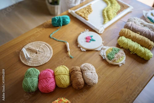 Punch needle. Asian Woman making handmade Hobby knitting in studio workshop. designer workplace Handmade craft project DIY embroidery concept.