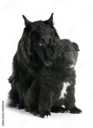 dog, puppy, puppy, young, baby, adult, mother, female, 2, black, shepherd, sheepdog, studio, white background, pet, animal, purebred, pedigree, canino, stroking, tenderness