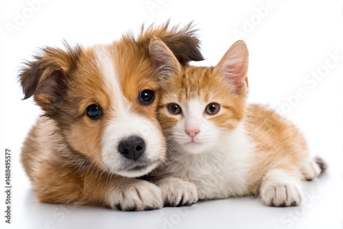 Puppy and kitten lying together on white background. Cat and dog hugging. Advertising theme for pet store or veterinary clinic.