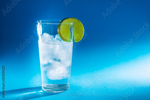 pure water in a glass of real ice and a slice of fresh lime in the rays of light