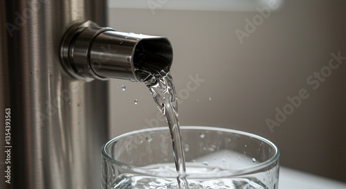 Pure Water Pouring from Stainless Steel Dispenser into Glass