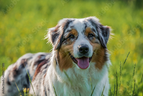 grass, spring, colours, no people, friends, nature, day, meadow, nose, mouth, animal, tree, pet, young, white, flower, background, fun, purebred dog, purebred, canino, tongue, summer, spotted, shepherd, plant, australian, shaggy, paw, park, domestic, nobody, head, fur, cheerful, funny, eye, dog, breed, green, fresh, cute, happy, walk