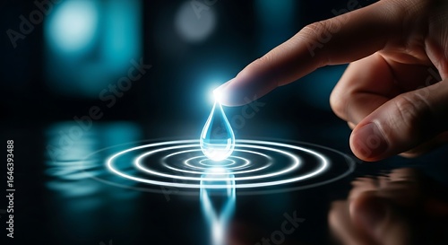 Purity and resource concept. A finger touches a holographic water drop, creating a gentle ripple effect, representing purity or water resources.