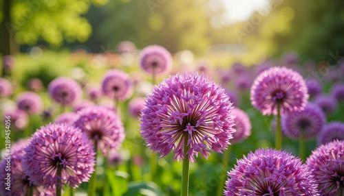 purple, allium, flower, garden, blooming, sunlight, nature, flora, blossom, vibrant, seasonal, botanical, colourful, meadow, spring, growth, landscape, flowerbed, lush, beauty, tranquil, fresh, harmony, peaceful, floral, park, closeup, enchanting, seasonal change, pollination, gardening, summer, garden design, wildlife, nutrient, earth, earth-tone, greenery