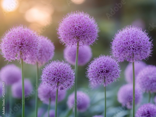allium, flower, purple, garden, bloom, blossom, sunset, nature, floral, plant, ball-shaped, vibrant, round, botanical, stalk, outdoors, summer, decorative, closeup, growth, ornamental, flocked, sunlight, natural, flora, background, beauty, colours, field, spring, blooming, park, bulb, botany, stem, meadow