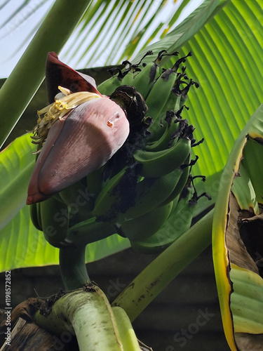 Purple banana flower or banana heart. Vegan Banana Flower for vegans or vegetarians. Banana flower and young green bananas on the tree.