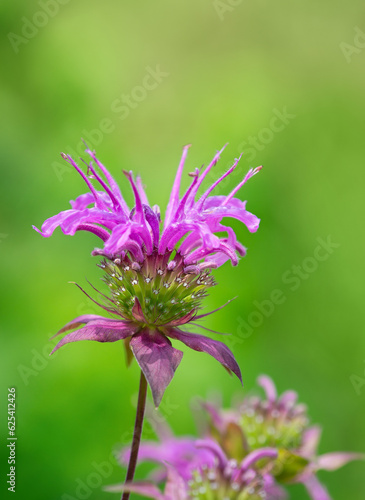 Purple Bee Balm flower blooming in the garden. Closeup. Natural green background with copy space.