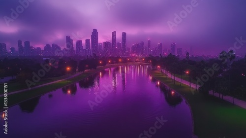 city landscape, lake, purple, dusk, twilight, night, city, building, skyscraper, urban, calm, serene, peaceful, tranquil, evening, skyline, light, park, tree, water, horizon, landscape, aerial, view, photo, picture, image, photo, city landscape, city lights, night view, metropolis, downtown, modern, tower, structure, illuminated, scenic, atmosphere, vibrant, architecture, building, sky, sunset, business, sun, skyscraper