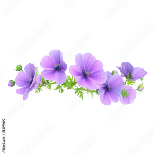 Purple cosmos flowers with green leaves arranged in delicate floral design, showcasing vibrant petals and natural wild garden aesthetic. Perfect for decorative or botanical themes