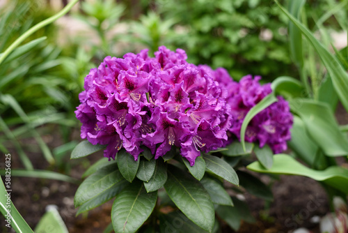 Purple flowers of the Rasputin rhododendron in the spring in the garden