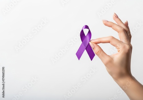 purple, ribbon, woman, hand, awareness, month, epilepsy, domestic, violence, alzheimer, cancer, international, white, background, banner, copy, space, support, health, cause, symbol, gesture, charity, campaign, care, attention, message, signs, solidarity, empowerment, hope, recognition, prevention, inspiration, design