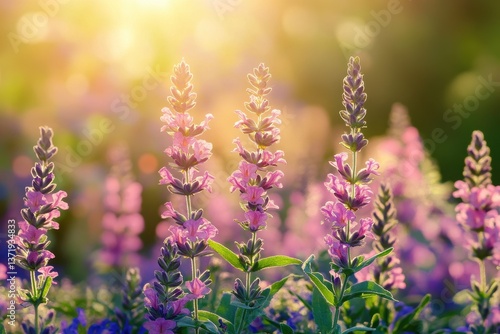 Purple salvia flowers bloom beautifully in the bright sunlight. Use it for springtime, gardening, or natural beauty themed designs.