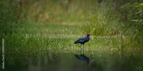 water, nature, forest, animal, green, black, blue, bird, red, park, feather, colourful, beautiful, natural, beak, wildlife, fauna, avian, hen, exotic, wing, outdoors, water-hen, purple, walking, wild