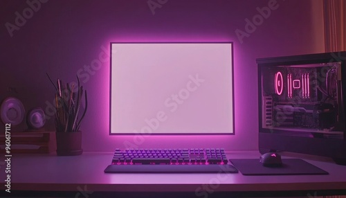 Purple-Lit Gaming Setup with Blank Monitor