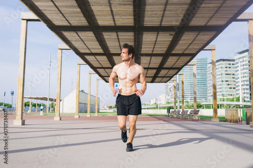 action, activewear, athlete, city, determination, effort, health, healthy living, holding, jog, one person, outside, run, shirtless, short, sport, activewear, summer, summer day, sunny day, sunrise, town, tracksuit, urban setting, vitality, wellness, working out