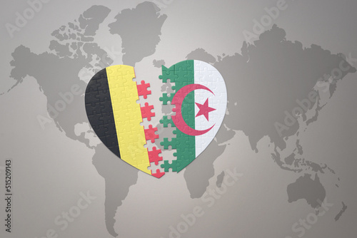 puzzle heart with the national flag of belgium and algeria on a world map background.Concept.