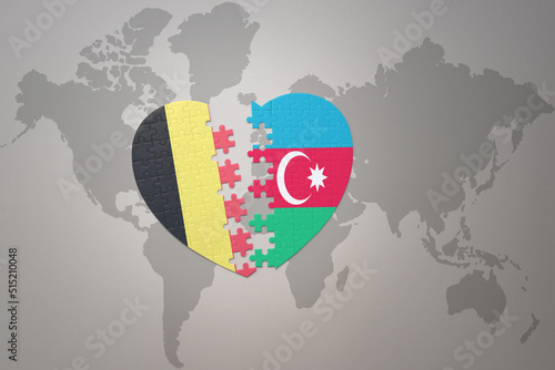 puzzle heart with the national flag of belgium and azerbaijan on a world map background.Concept.