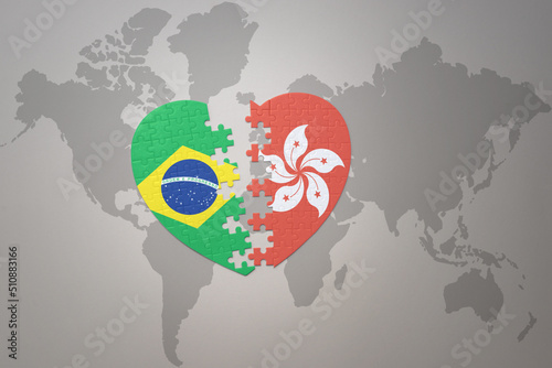puzzle heart with the national flag of brazil and hong kong on a world map background.Concept.