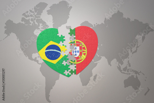 puzzle heart with the national flag of brazil and portugal on a world map background.Concept.