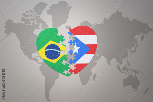 puzzle heart with the national flag of brazil and puerto rico on a world map background.Concept.