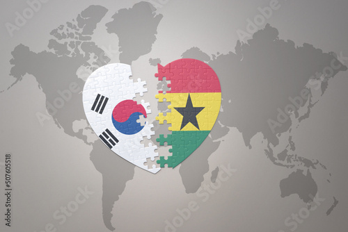 puzzle heart with the national flag of ghana and south korea on a world map background. Concept.