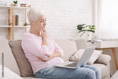 woman, laptop, senior, home, cyberspace, reading, browsing, caucasian, surfing, wireless, smiling, indoor, interior, personal computer, computer, mature, old, casual attire, sitting, using, notebook, lifestyle, modem, elderly, aged, alone, contemporary, people, background, business, education, female, grandmother, lady, free space, copy space, empty space, sofa, puzzle, problem, question, thoughtful, pensive, course, online