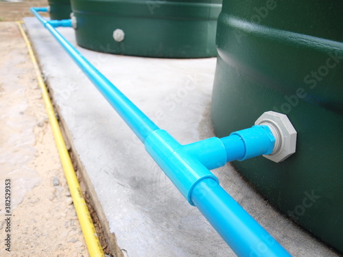PVC pipe connecting water tank. The blue plastic pipe connects all the green water tanks together, a water reserve concept. Selective focus