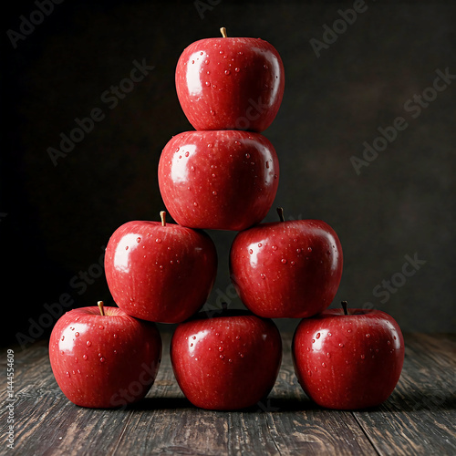 Pyramid of Fresh Red Apples on Wooden Table with Dark Background