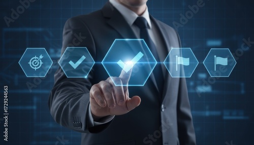 Quality Assurance in Digital Business: A suited business man touching virtual check mark on digital screen. Symbolizing QA and regulatory compliance
