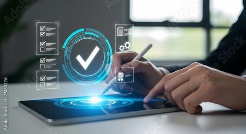 quality control, checklist, digital, tablet, technology, business, assurance, compliance, standard, regulation, inspecting, inspection, management, process, verification, validation, tick, checkmark, icon, graphic, illustration, hand, screen, modern, futuristic, certification, document, form, agreements, approval