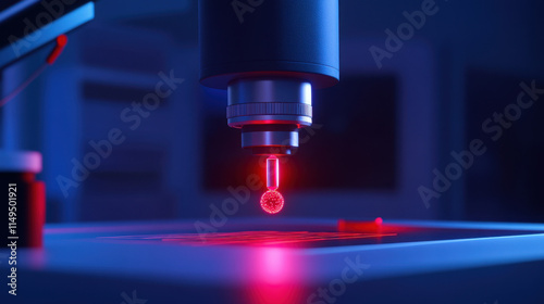 Quantum, A microscope with a red laser focuses on a sample, illuminated in a dark laboratory setting, showcasing advanced technology and precision.