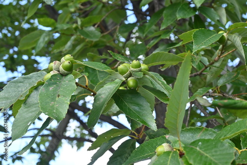 Quercus serrata unripe acorns. The trunk of the tree is used for shiitake mushrooms cultivation.