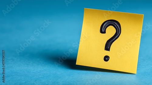 Question Mark on Yellow Sticky Note Against Blue Background Studio Shot