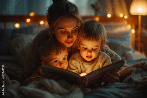 mother, children, bedtime, bedchamber, reading, book, story, pajama, family, love, bonding, together, warmth, cosy, comfort, listening, attention, motherhood, parenting, home, domestic life, innocence, childhood, sibling, sister, brother, relaxation, quiet, calm, lamp, light, education, learning, imagination, happy, joyful, caring, affectionate, contentment, trust, connection, memory