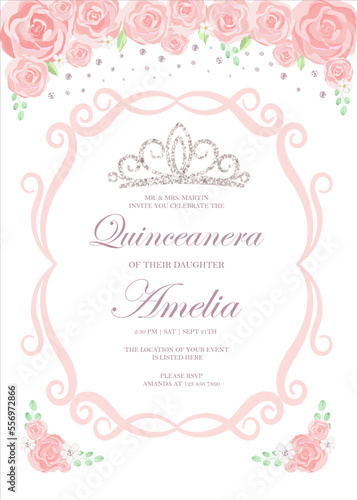 invitation, card, birthday, princess, template, girl, 15, design, flower, party, floral, happy, leaf, celebration, teenage, text, teenage, feminine, flora, teenage, vine, birth, quince, queen, botanic, trendy, invitation, celebrate, festive, greenery, classic, invite, vector, banner, illustration, congratulation, decoration, decor, greeting