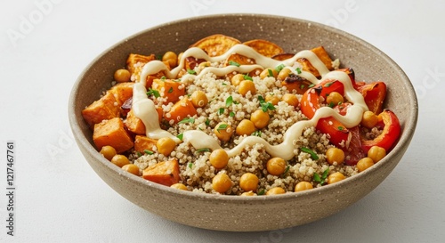 Quinoa Salad with Roasted Veggies, Chickpeas, and Tahini Dressing