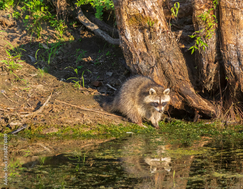 Raccoon washing its paws in water