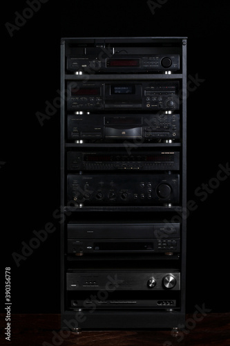 equipment, vintage, old, audio, video, sound, image, tape recorder, tuner, earphones, rack, shelf, stand, parquet, floor, closeup, dark background