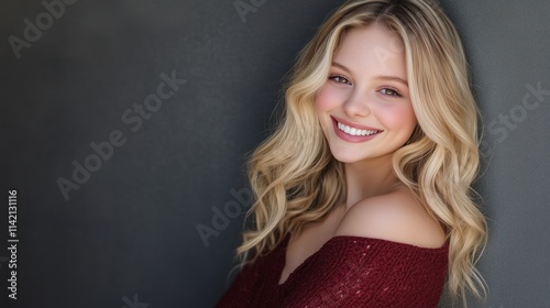 Radiant Blonde Woman Smiling in Off-Shoulder Dress